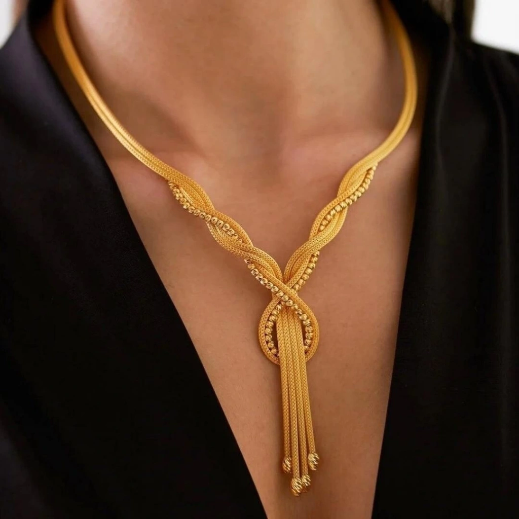 Kolye, 45 cm uzunluğundadır ve mesh örgü şeklindedir.