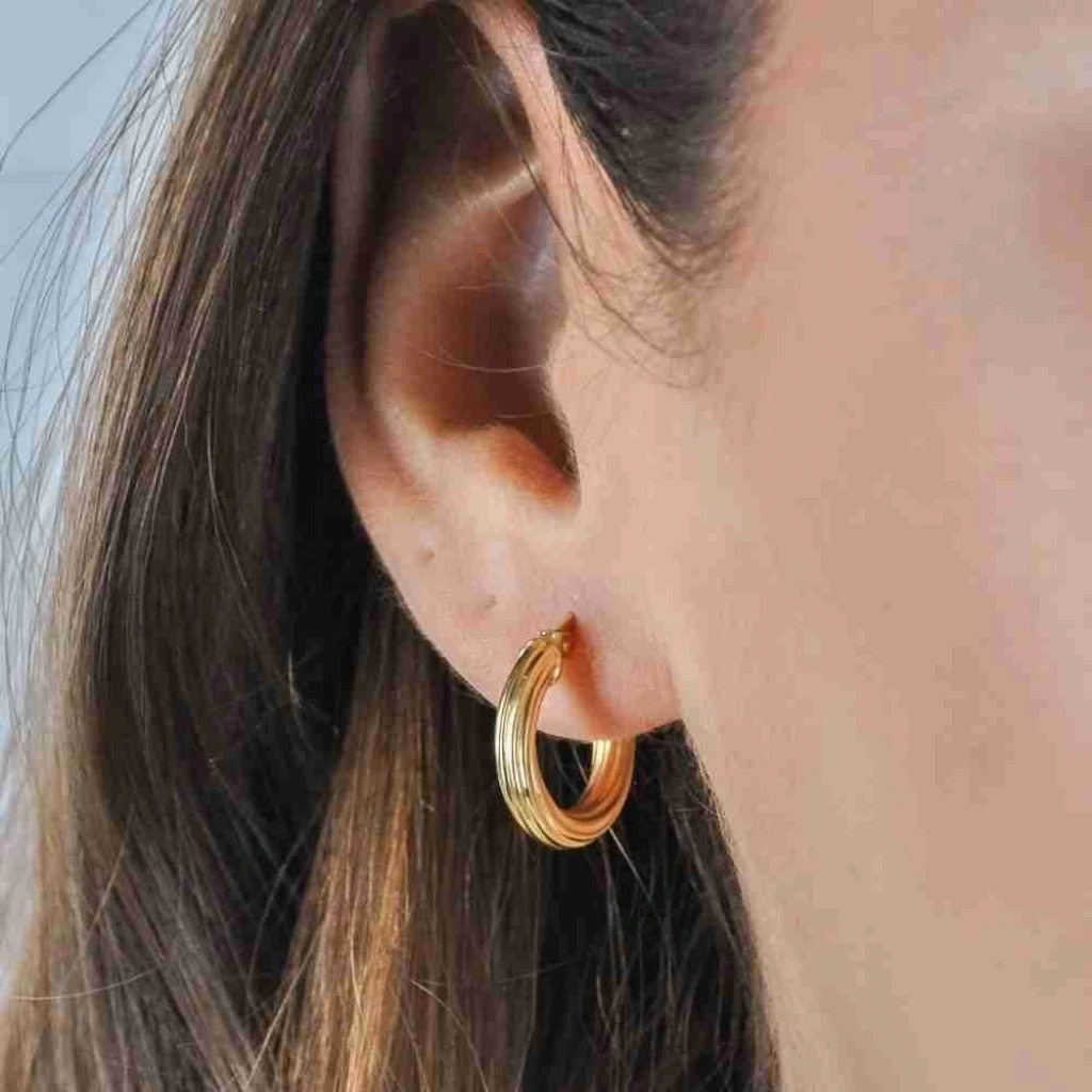 Küpenin şeritleri, ona şık ve modern bir görünüm kazandırıyor. Küpenin halka formu, ona klasik ve zamansız bir hava katıyor.