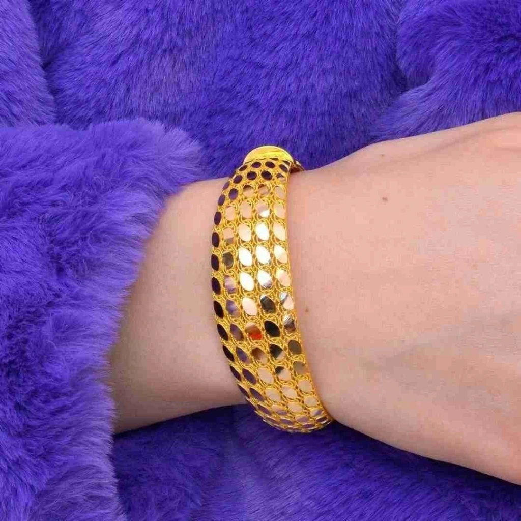 Evla Kuyumculuk'un özel koleksiyonundan 14 Ayar Altın Tasarım Pullu Kelepçe, göz alıcı ve şık bir kuyumculuk ürünüdür. Bu kelepçe, yüksek kaliteli 14 ayar altın kullanılarak özenle tasarlanmış ve işlenmiştir. Pullu tasarımıyla dikkat çeken bu kelepçe, benzersiz bir görünüm sunar ve her türlü kıyafetle mükemmel bir uyum sağlar. Bu özel kelepçe, 18,50 gram ağırlığıyla sağlam ve gösterişli bir yapıya sahiptir. Bu sayede bileğinizi etkileyici bir şekilde süsler ve şıklığınızı vurgular. Pullu tasarım, kelepçenin üzerindeki detayları daha belirgin hale getirir ve ışıltılı bir etki yaratır.