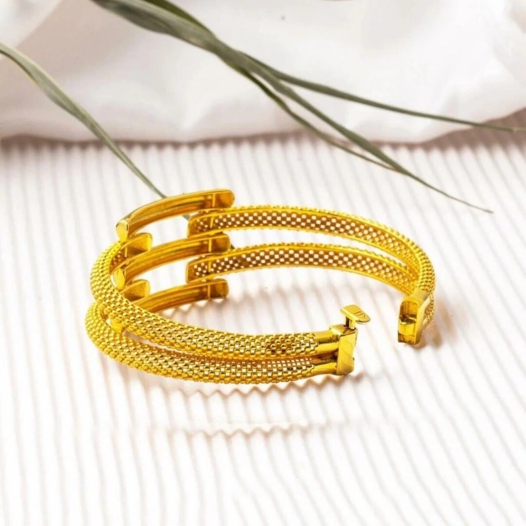 Evla Kuyumculuk'un özel koleksiyonunda bulunan 3 Sıra 8 Ayar Altın Kaburga Kelepçe, şıklığı ve zarafeti bir araya getiren etkileyici bir parçadır. Bu kelepçe, yüksek kaliteli 8 ayar altın kullanılarak özenle tasarlanmış ve titizlikle şekillendirilmiştir. Kelepçenin 3 sıra kaburga tasarımı, göz alıcı bir görünüm sunar. Altın zincirler ustalıkla işlenerek üç sıra halinde detaylandırılmıştır. Bu özel tasarım, bileğinizi zarif bir şekilde saran ve dikkat çeken bir parça ortaya çıkarır.