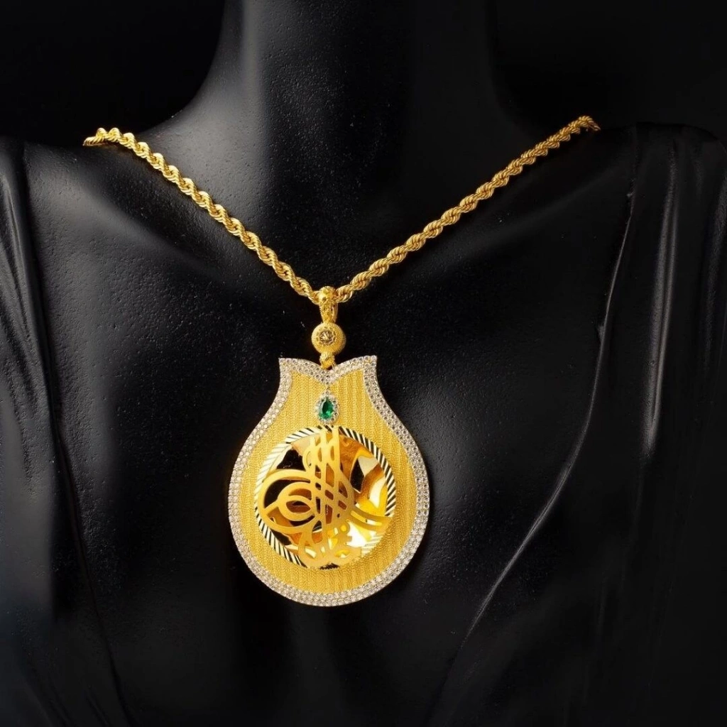 Evla Kuyumculuk, estetiği ve zarafeti birleştiren özgüntasarımlarıyla öne çıkan bir markadır. Bu kapsamda gururla sunulan 8 Ayar HasırLale Tuğra Altın Kolye,  benzersiz birparça olarak öne çıkar. 14,98 gram ağırlığındaki bu tuğralı altın kolye, yüksekkaliteli 8 ayar altın kullanılarak ustalıkla üretilmiştir. Hasır lale motiflitasarımı, kolyeye zarif bir dokunuş katar ve Tuğra sembolünü öne çıkarır.Tuğra, Osmanlı İmparatorluğu'nun tarihi sembolüdür ve güç, otorite ve zenginbir kültürel mirası temsil ederken lale de zarafet ve güzellik sembolüdür.